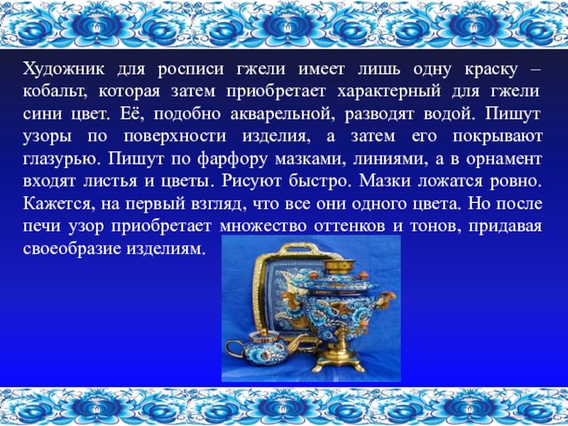 Слайд 8Художник для росписи гжели имеет лишь одну краску – кобальт, которая