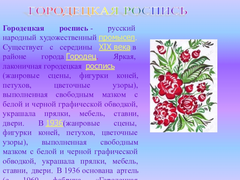 Городецкая роспись - русский народный художественный промысел. Существует с середины XIX века в