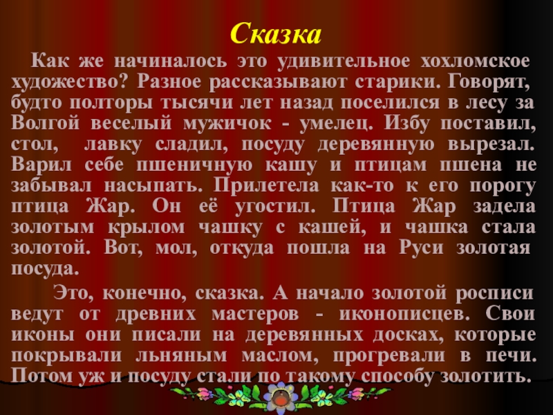 рассказывают старики. Говорят, будто полторы тысячи лет назад поселился в лесу за Волгой веселый мужичок - умелец. Избу поставил, стол, лавку сладил, посуду деревянную вырезал. Варил себе пшеничную кашу и птицам пшена не забывал насыпать. Прилетела как-то к его порогу птица Жар. Он её угостил. Птица Жар задела золотым крылом чашку с кашей, и чашка стала золотой. Вот, мол, откуда пошла на Руси золотая посуда.