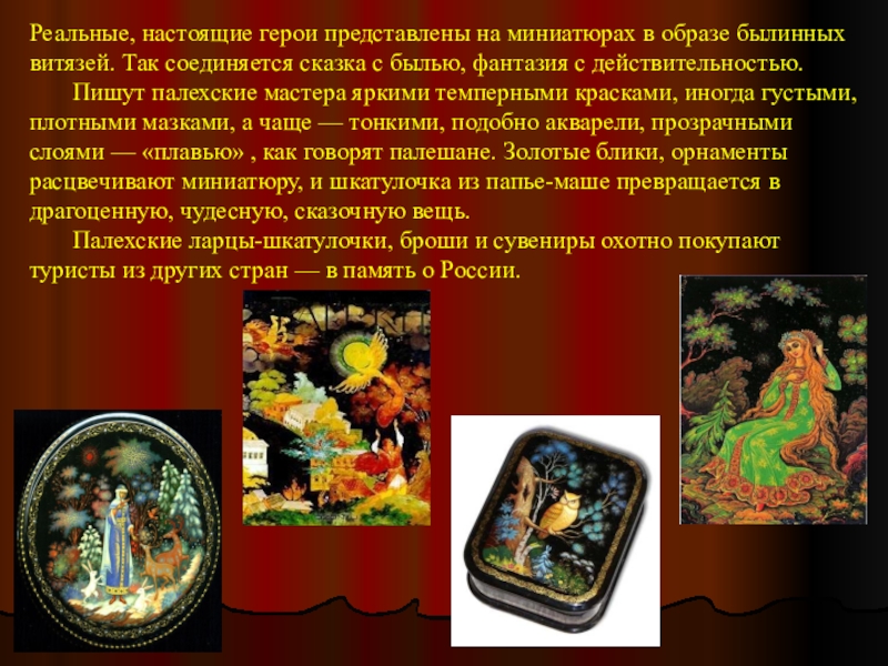 Палехские ларцы-шкатулочки, броши и сувениры охотно покупают туристы из других стран — в память о России.