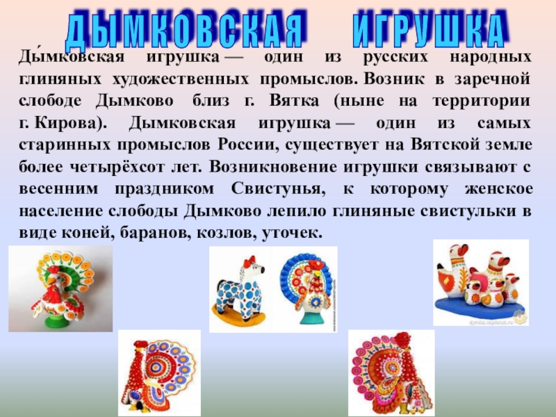 Ды́мковская игрушка — один из русских народных глиняных художественных промыслов. Возник в заречной слободе Дымково близ г. Вятка (ныне на территории г. Кирова). Дымковская игрушка — один из самых старинных промыслов России, существует на Вятской земле более четырёхсот лет. Возникновение игрушки связывают с весенним праздником Свистунья, к которому женское население слободы Дымково лепило глиняные свистульки в виде коней, баранов, козлов, уточек.