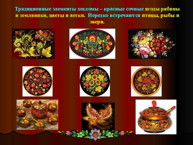 Слайд 5Традиционные элементы хохломы – красные сочные ягоды рябины и земляники, цветы