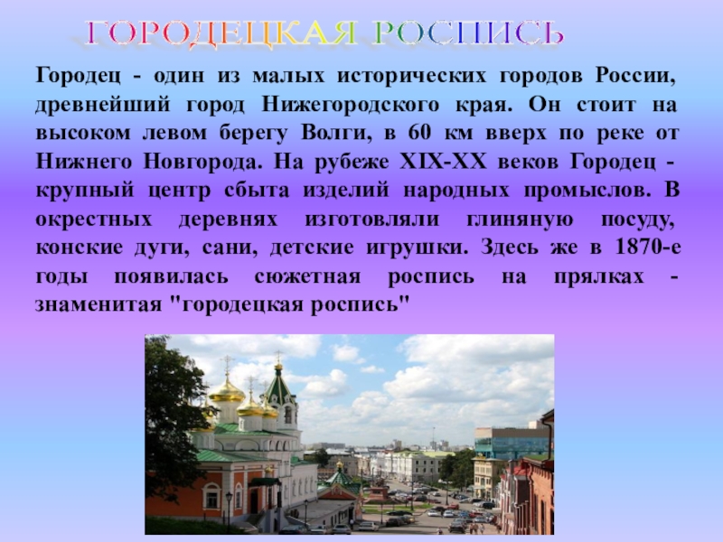 края. Он стоит на высоком левом берегу Волги, в 60 км вверх по реке от Нижнего Новгорода. На рубеже XIX-XX веков Городец - крупный центр сбыта изделий народных промыслов. В окрестных деревнях изготовляли глиняную посуду, конские дуги, сани, детские игрушки. Здесь же в 1870-е годы появилась сюжетная роспись на прялках - знаменитая "городецкая роспись"