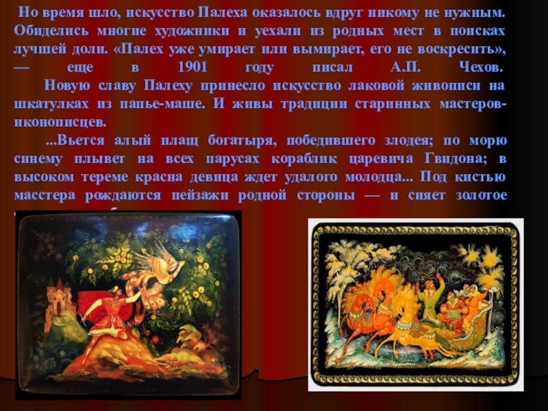 Обиделись многие художники и уехали из родных мест в поисках лучшей доли. «Палех уже умирает или вымирает, его не воскресить», — еще в 1901 году писал А.П. Чехов.