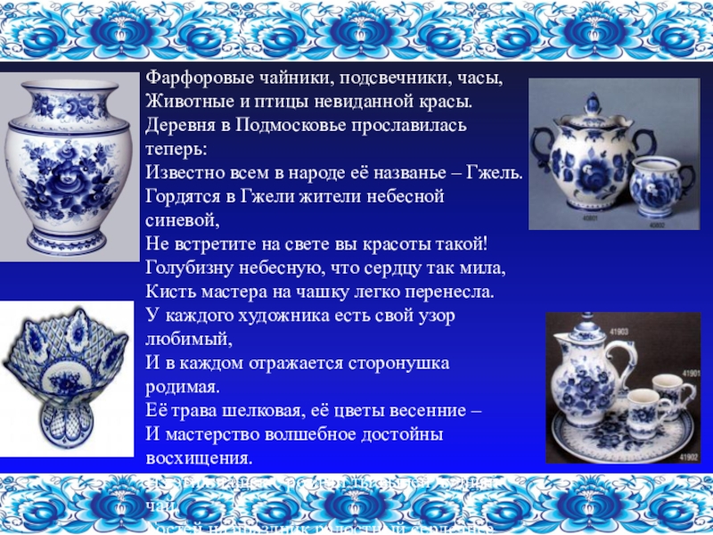 Гордятся в Гжели жители небесной синевой,