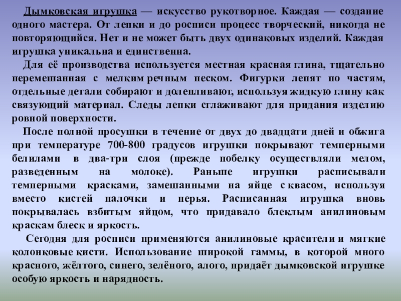 мастера. От лепки и до росписи процесс творческий, никогда не повторяющийся. Нет и не может быть двух одинаковых изделий. Каждая игрушка уникальна и единственна.