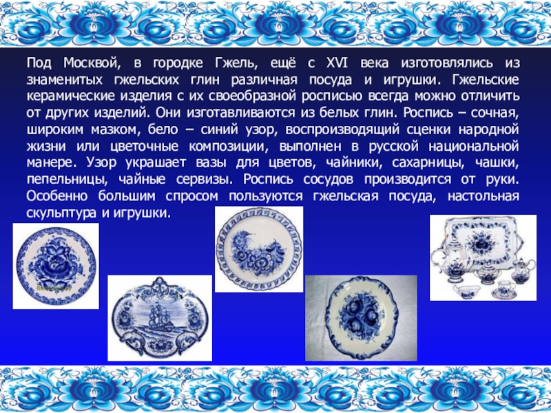 знаменитых гжельских глин различная посуда и игрушки. Гжельские керамические изделия с их своеобразной росписью всегда можно отличить от других изделий. Они изготавливаются из белых глин. Роспись – сочная, широким мазком, бело – синий узор, воспроизводящий сценки народной жизни или цветочные композиции, выполнен в русской национальной манере. Узор украшает вазы для цветов, чайники, сахарницы, чашки, пепельницы, чайные сервизы. Роспись сосудов производится от руки. Особенно большим спросом пользуются гжельская посуда, настольная скульптура и игрушки.