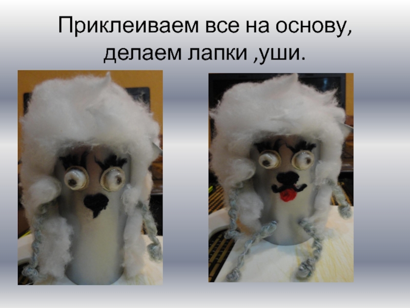 Слайд 8Приклеиваем все на основу, делаем лапки ,уши.