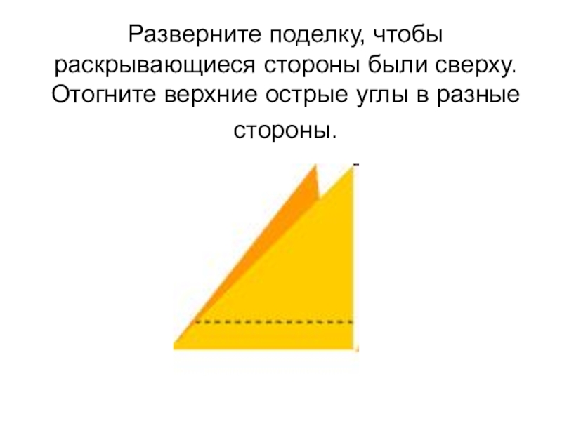 Слайд 4Разверните поделку, чтобы раскрывающиеся стороны были сверху. Отогните верхние острые углы