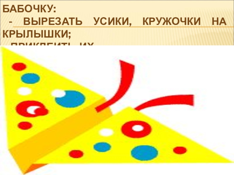 Слайд 7 ТЕПЕРЬ ОСТАЛОСЬ ТОЛЬКО УКРАСИТЬ БАБОЧКУ: - ВЫРЕЗАТЬ УСИКИ, КРУЖОЧКИ НА