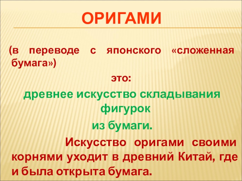 ОРИГАМИ (в переводе с японского «сложенная бумага»)это: древнее искусство складывания фигурок из бумаги. Искусство оригами своими корнями уходит в древний Китай, где и была открыта бумага.
