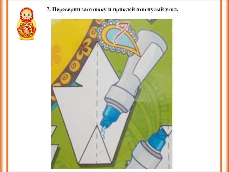 Слайд 107. Переверни заготовку и приклей отогнутый угол.