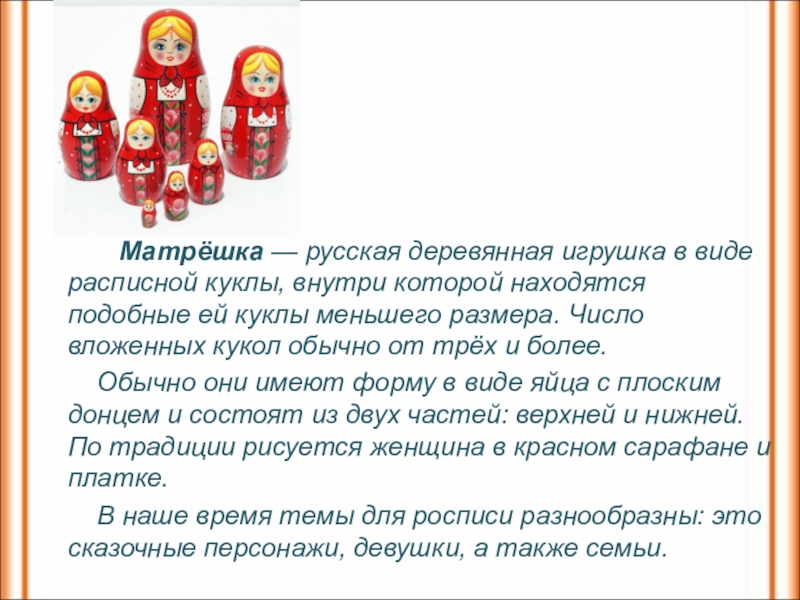 Матрёшка — русская деревянная игрушка в виде расписной куклы, внутри которой находятся подобные ей куклы меньшего