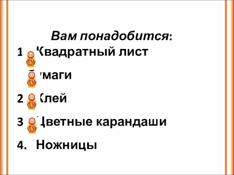 Вам понадобится:  Квадратный лист бумаги  Клей  Цветные карандаши  Ножницы