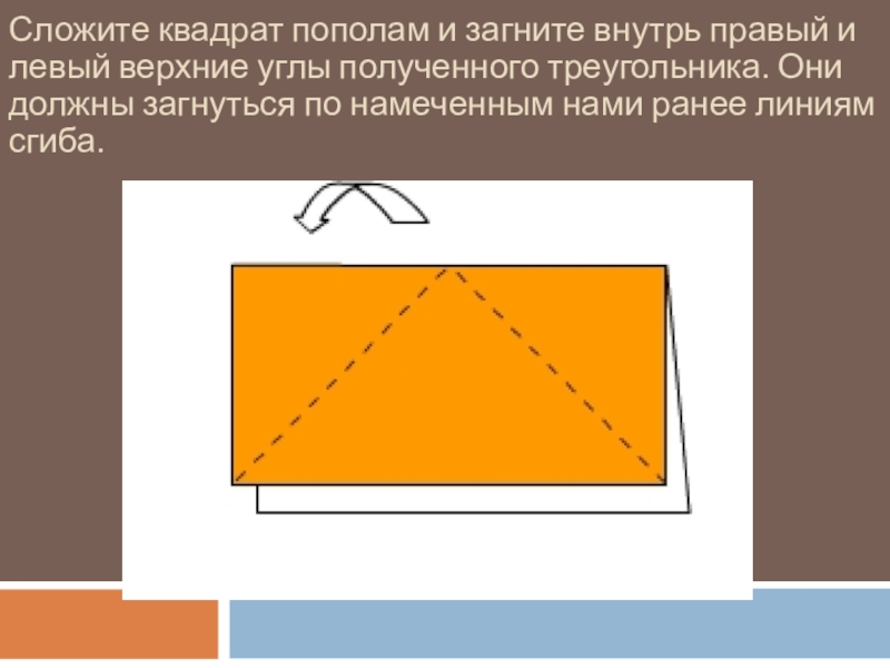 Слайд 4Сложите квадрат пополам и загните внутрь правый и левый верхние углы
