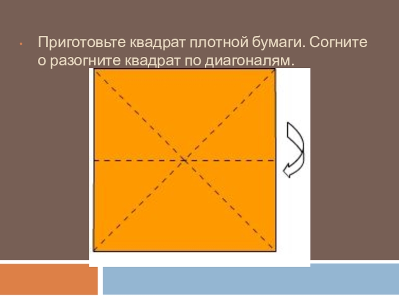 Слайд 3Приготовьте квадрат плотной бумаги. Согните о разогните квадрат по диагоналям.