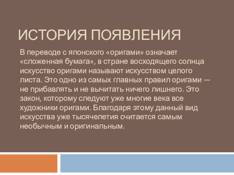 ИСТОРИЯ ПОЯВЛЕНИЯВ переводе с японского «оригами» означает «сложенная бумага», в стране восходящего солнца искусство оригами называют искусством целого листа. Это одно из самых главных правил оригами — не прибавлять и не вычитать ничего лишнего. Это закон,