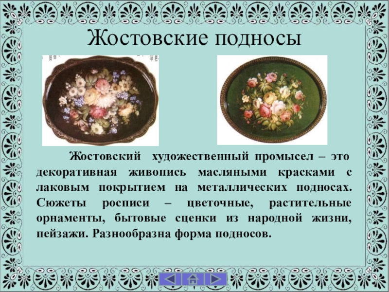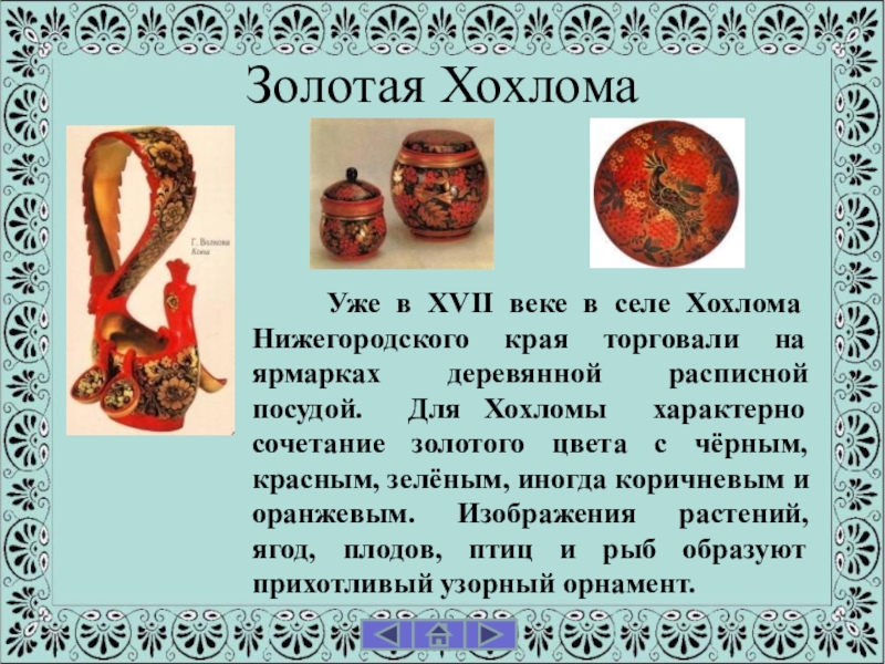 Особенности городецкой росписи – чистые, яркие краски, чёткий контур, белые штрихи, создающие условный объём и живописность. Городецкие мастера изображают не только растительный орнамент, сказочных персонажей, но и жанровые сценки.