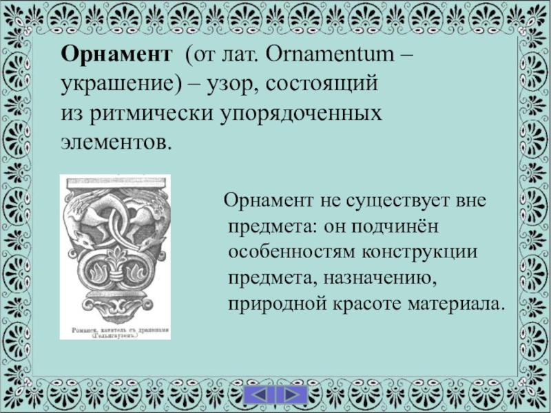 Орнамент не существует вне предмета: он подчинён особенностям конструкции предмета, назначению, природной красоте материала.