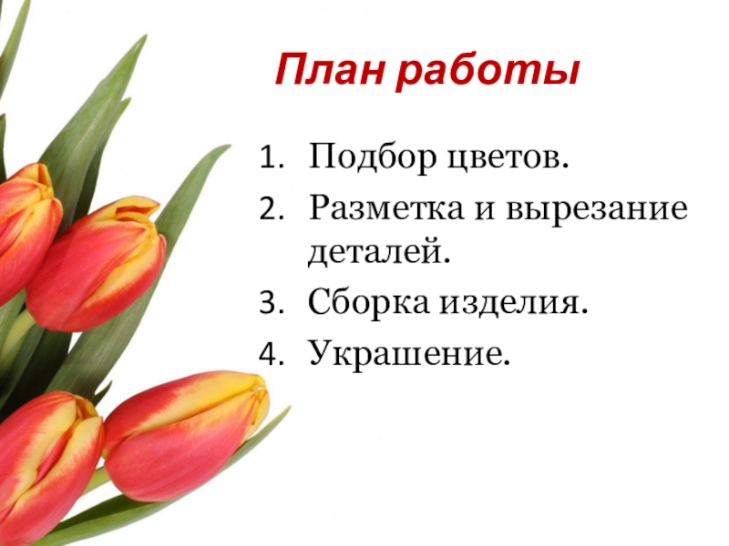 План работыПодбор цветов.Разметка и вырезание деталей.Сборка изделия.Украшение.