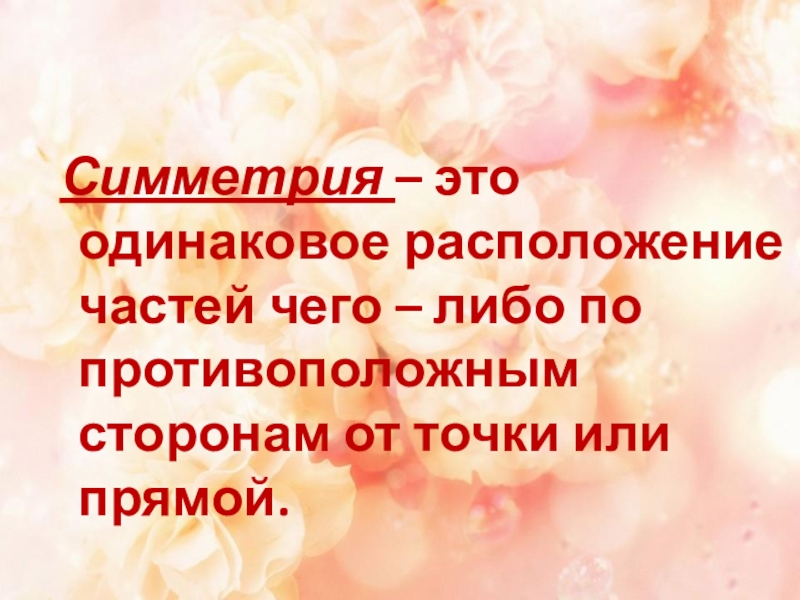 Симметрия – это одинаковое расположение частей чего – либо по противоположным сторонам от точки или прямой.