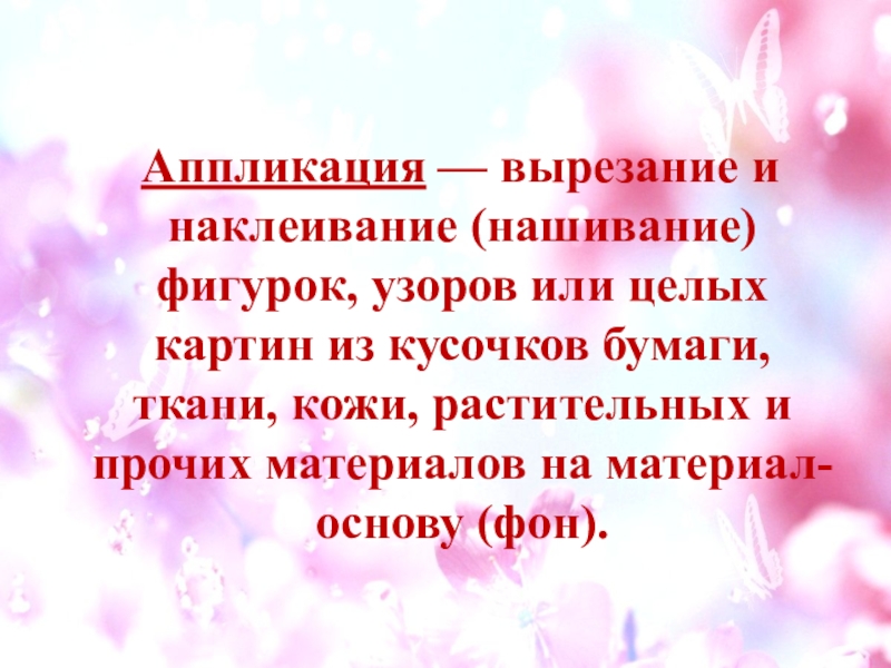 Аппликация — вырезание и наклеивание (нашивание) фигурок, узоров или целых картин из кусочков бумаги, ткани, кожи,