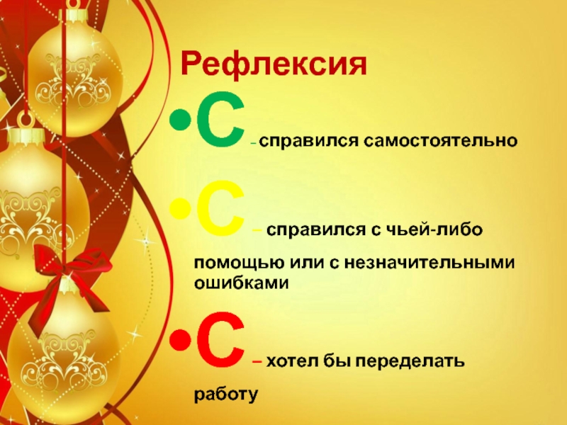 РефлексияС – справился самостоятельноС – справился с чьей-либо помощью или с незначительными ошибкамиС – хотел бы переделать