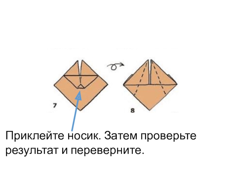 Слайд 8Приклейте носик. Затем проверьте результат и переверните.