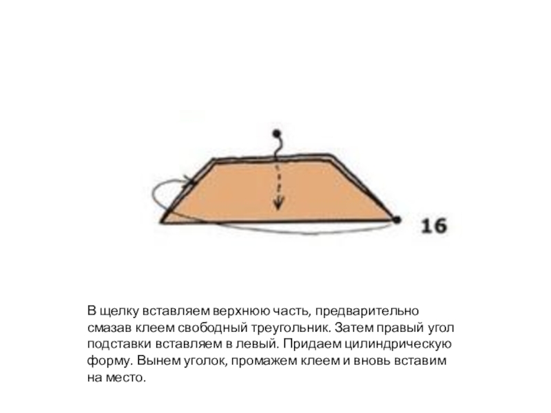 Слайд 15В щелку вставляем верхнюю часть, предварительно смазав клеем свободный треугольник. Затем