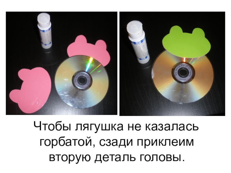 Слайд 7 Чтобы лягушка не казалась горбатой, сзади приклеим вторую деталь головы.