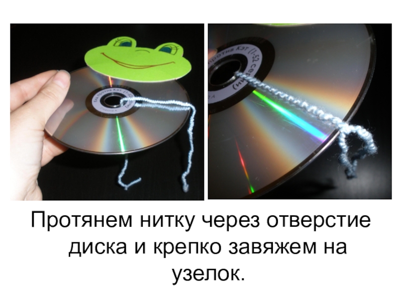 Слайд 10Протянем нитку через отверстие диска и крепко завяжем на узелок.