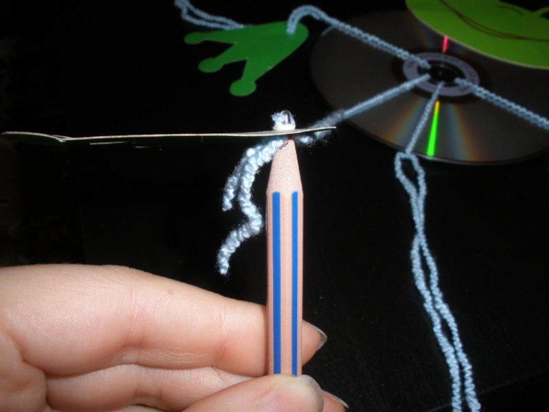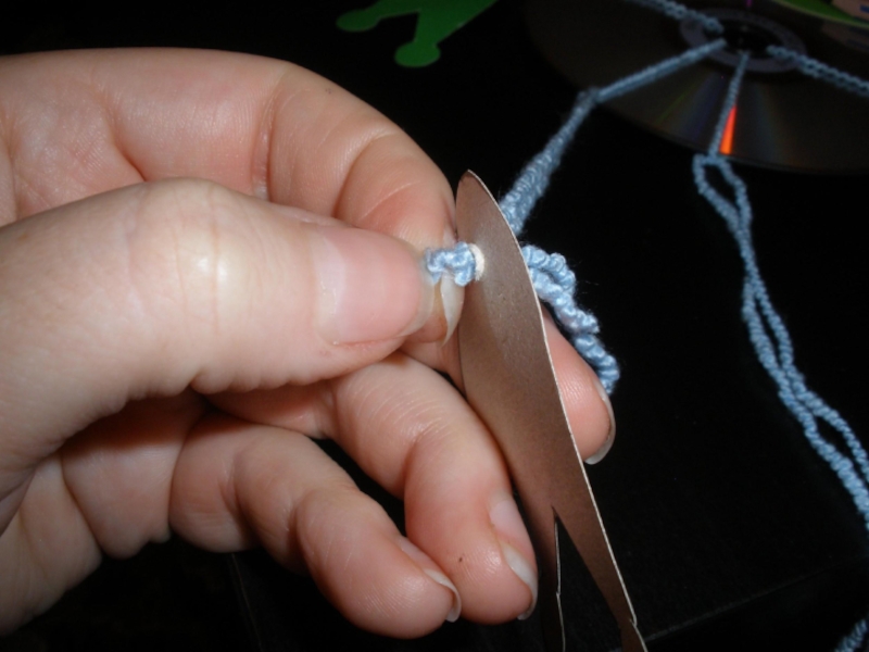 Протянем нитку через отверстие диска и крепко завяжем на узелок.