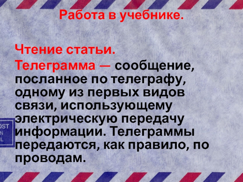 Работа в учебнике.  Чтение статьи.Телеграмма — сообщение, посланное по телеграфу, одному из первых видов связи, использующему