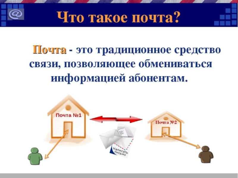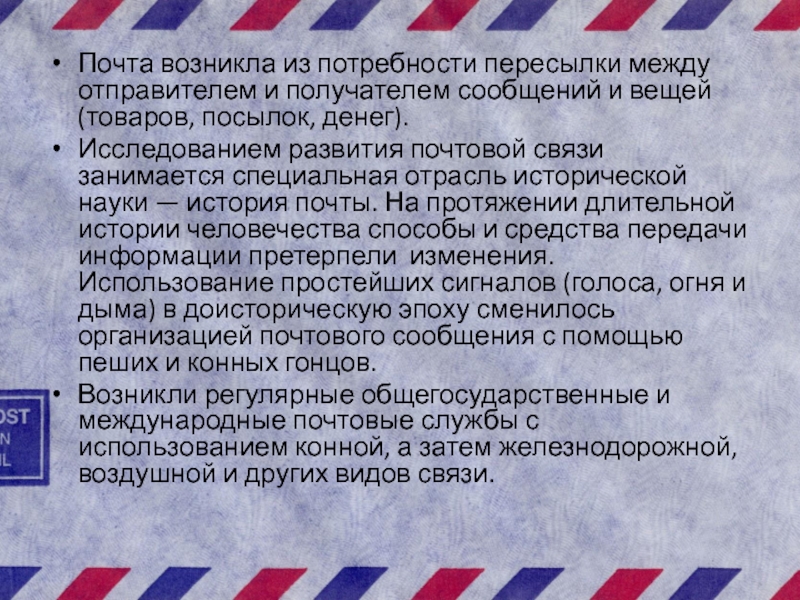 Слайд 3Почта возникла из потребности пересылки между отправителем и получателем сообщений и