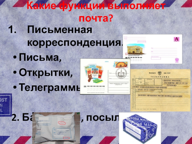 Какие функции выполняет почта?  Письменная корреспонденция.Письма,Открытки,Телеграммы.2. Бандероли, посылки.