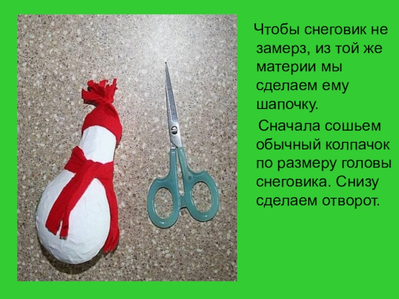 Чтобы снеговик не замерз, из той же материи мы сделаем ему шапочку.   Сначала