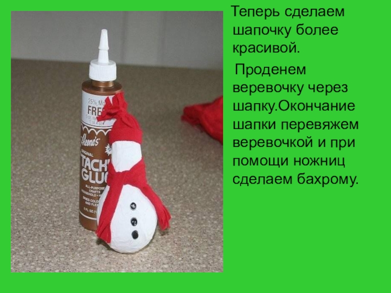 Теперь сделаем шапочку более красивой.   Проденем веревочку через шапку.Окончание шапки перевяжем веревочкой и