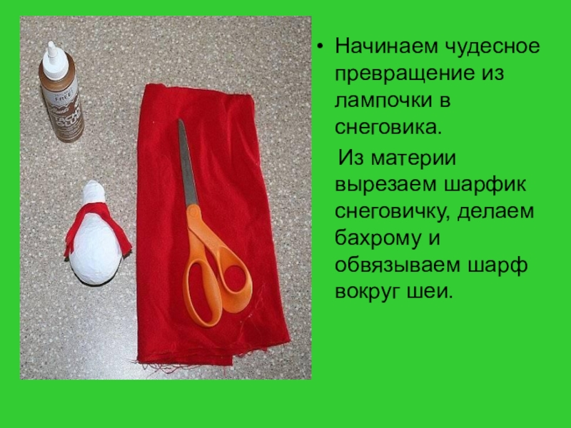 Начинаем чудесное превращение из лампочки в снеговика.  Из материи вырезаем шарфик снеговичку, делаем бахрому и обвязываем