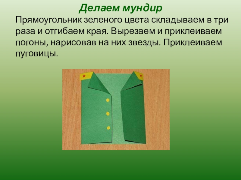 Делаем мундир Прямоугольник зеленого цвета складываем в три раза и отгибаем края. Вырезаем и приклеиваем погоны, нарисовав на них звезды. Приклеиваем пуговицы.
