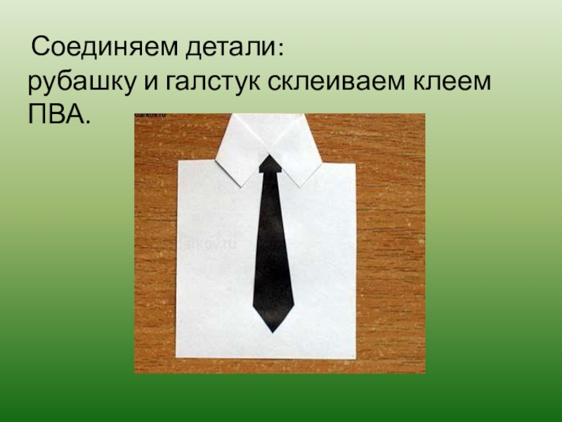 Слайд 3 Соединяем детали: рубашку и галстук склеиваем клеем ПВА.