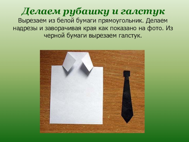 Слайд 2 Делаем рубашку и галстук Вырезаем из белой бумаги прямоугольник. Делаем надрезы и