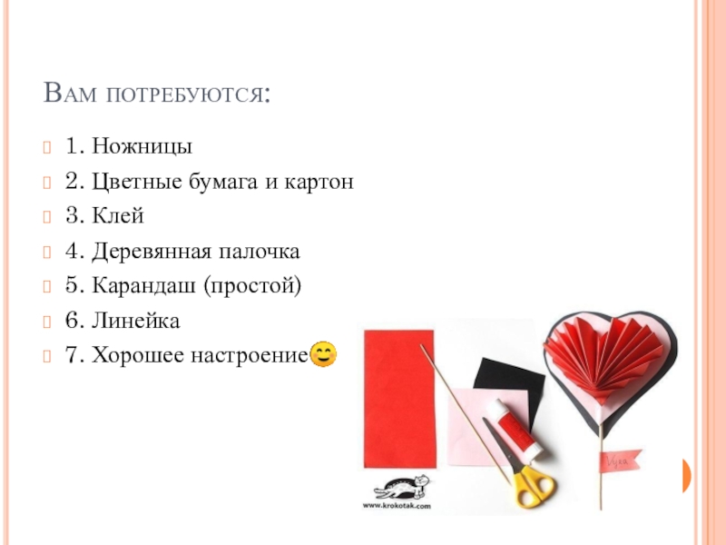 Вам потребуются:1. Ножницы2. Цветные бумага и картон3. Клей4. Деревянная палочка5. Карандаш (простой)6. Линейка7. Хорошее настроение