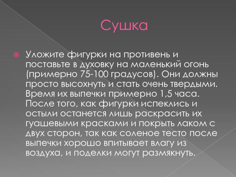 огонь (примерно 75-100 градусов). Они должны просто высохнуть и стать очень твердыми. Время их выпечки примерно 1,5 часа. После того, как фигурки испеклись и остыли останется лишь раскрасить их гуашевыми красками и покрыть лаком с двух сторон, так как соленое тесто после выпечки хорошо впитывает влагу из воздуха, и поделки могут размякнуть.
