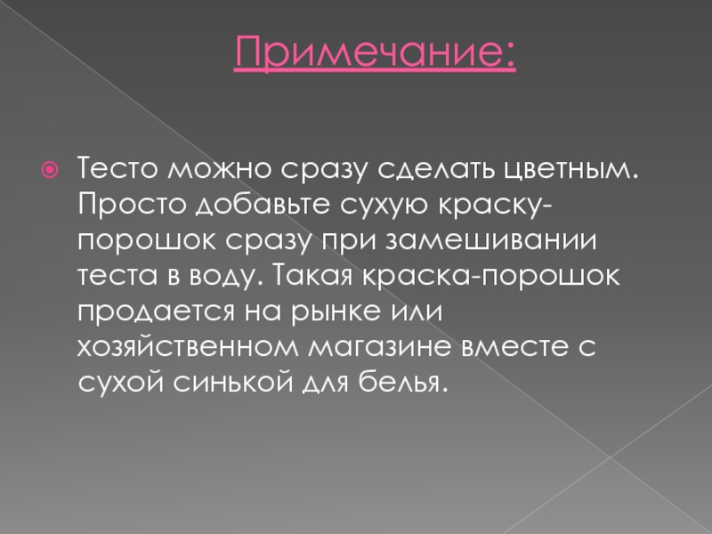 Примечание:  Тесто можно сразу сделать цветным. Просто добавьте сухую краску-порошок сразу при замешивании теста в воду. Такая
