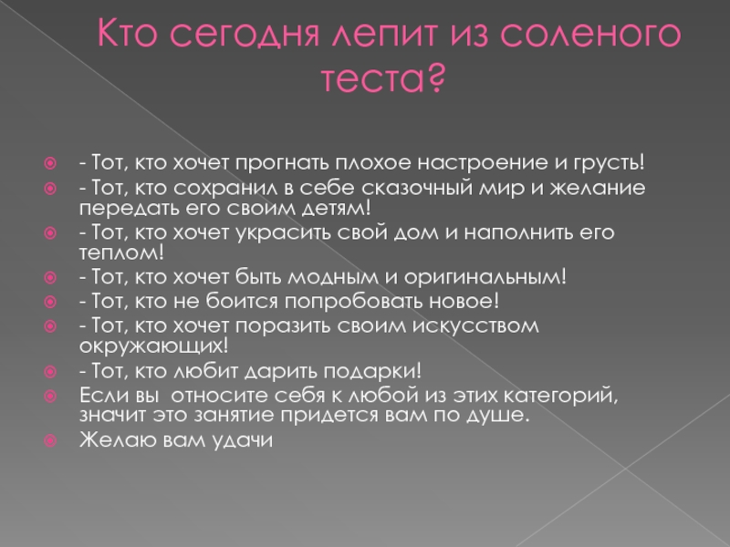 Кто сегодня лепит из соленого теста? - Тот, кто хочет прогнать плохое настроение и грусть!- Тот,