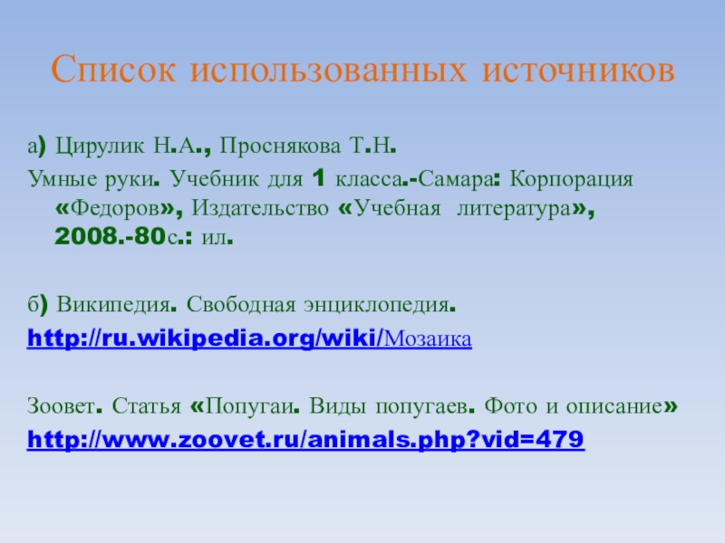 Список использованных источникова) Цирулик Н.А., Проснякова Т.Н.Умные руки. Учебник для 1 класса.-Самара: Корпорация «Федоров», Издательство «Учебная литература»,