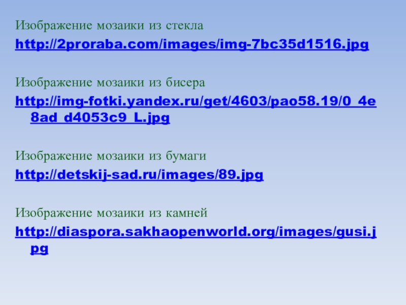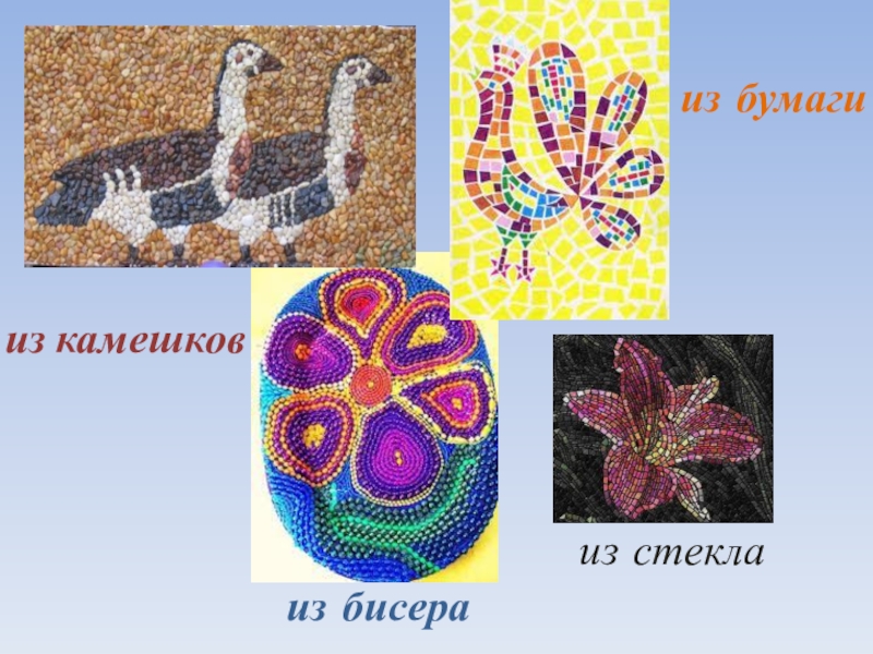 Изображение мозаики из стеклаhttp://2proraba.com/images/img-7bc35d1516.jpgИзображение мозаики из бисераhttp://img-fotki.yandex.ru/get/4603/pao58.19/0_4e8ad_d4053c9_L.jpgИзображение мозаики из бумагиhttp://detskij-sad.ru/images/89.jpgИзображение мозаики из камнейhttp://diaspora.sakhaopenworld.org/images/gusi.jpg