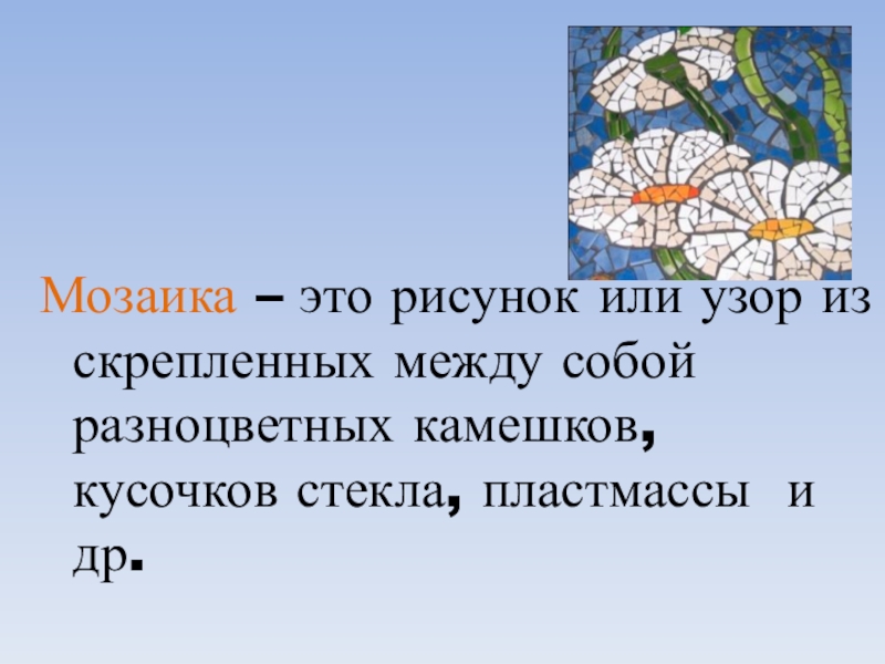 Мозаика – это рисунок или узор из скрепленных между собой разноцветных камешков, кусочков стекла, пластмассы и др.