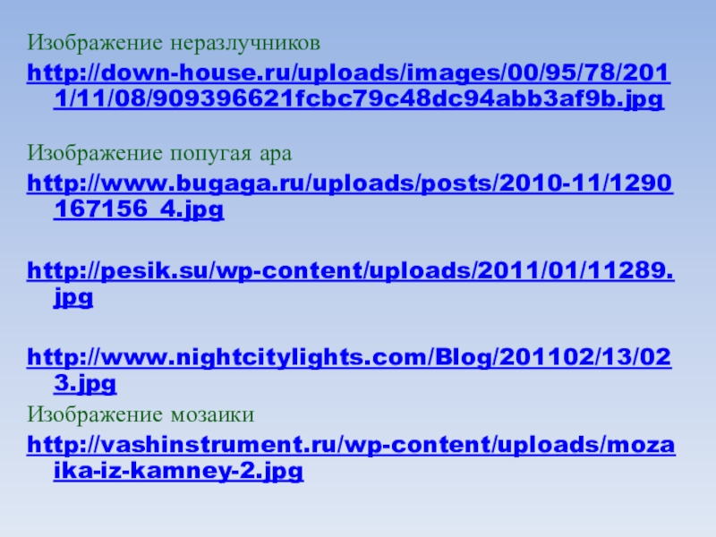 Изображение неразлучниковhttp://down-house.ru/uploads/images/00/95/78/2011/11/08/909396621fcbc79c48dc94abb3af9b.jpgИзображение попугая араhttp://www.bugaga.ru/uploads/posts/2010-11/1290167156_4.jpghttp://pesik.su/wp-content/uploads/2011/01/11289.jpghttp://www.nightcitylights.com/Blog/201102/13/023.jpgИзображение мозаикиhttp://vashinstrument.ru/wp-content/uploads/mozaika-iz-kamney-2.jpg