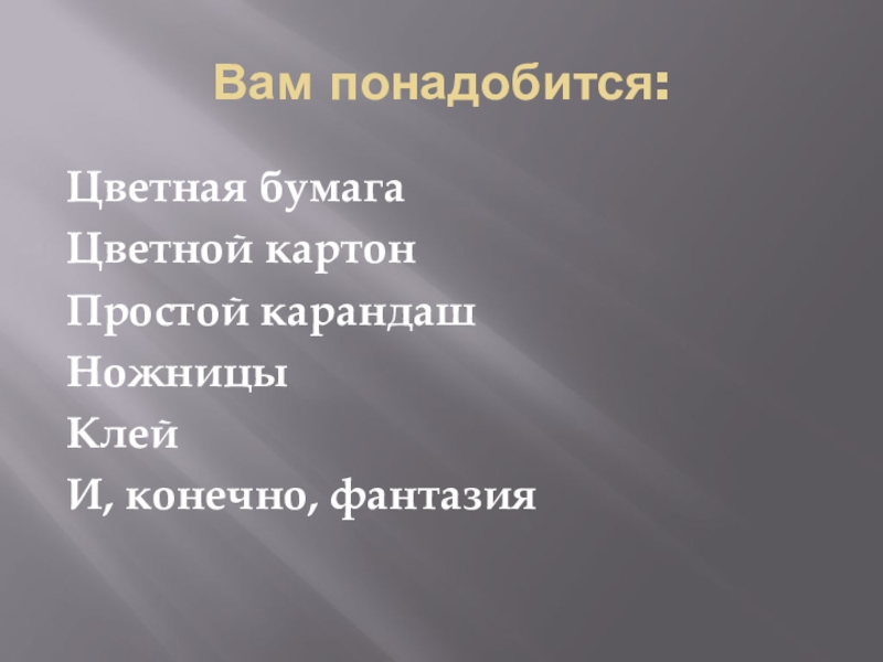 Вам понадобится:Цветная бумагаЦветной картонПростой карандашНожницыКлейИ, конечно, фантазия